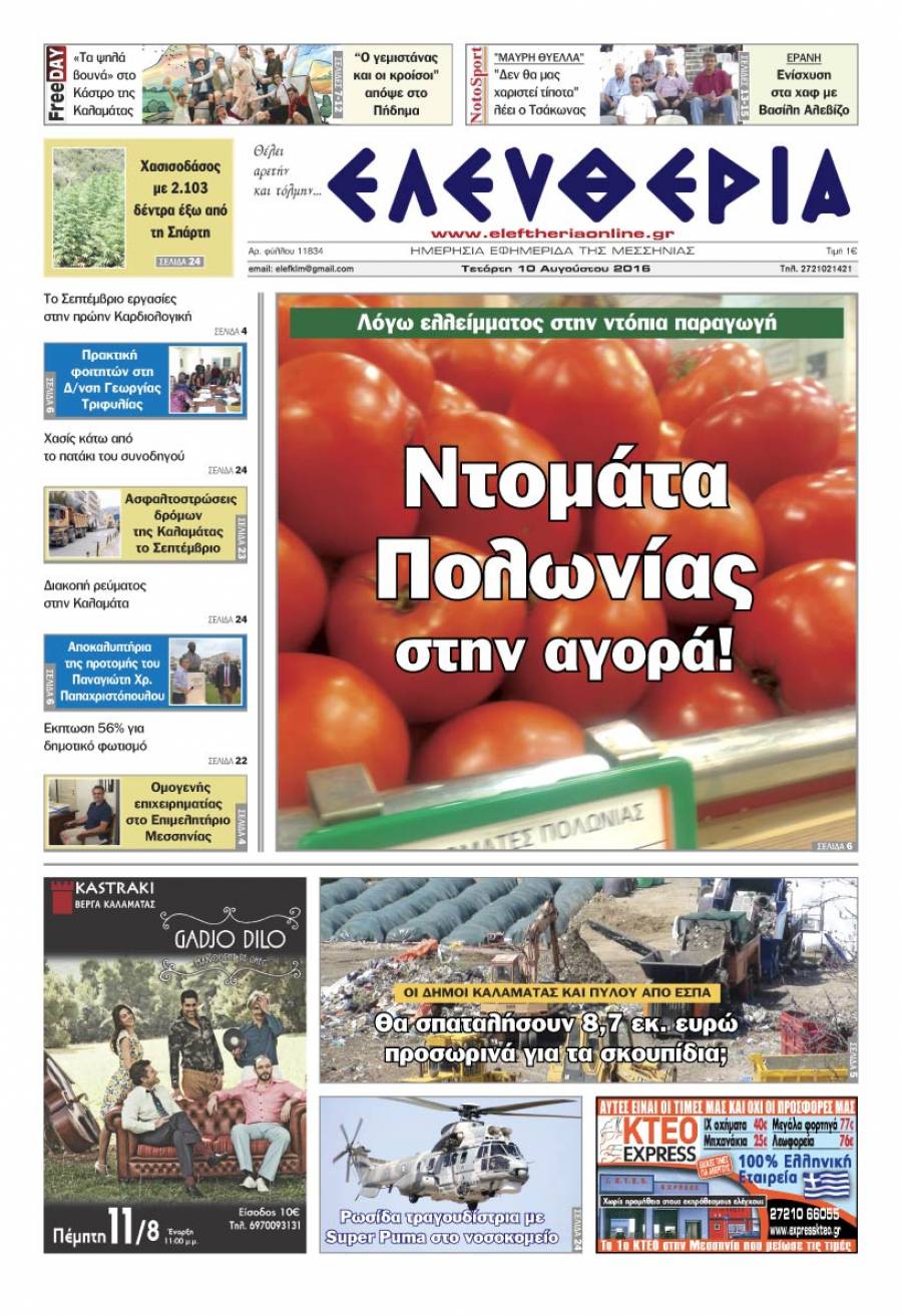 Το πρωτοσέλιδο της "Ελευθερίας" Τετάρτη 10 Αυγούστου 2016 Για να κατεβάσετε το αρχείο πατήστε πάνω στο κουμπί που γράφει download pdf