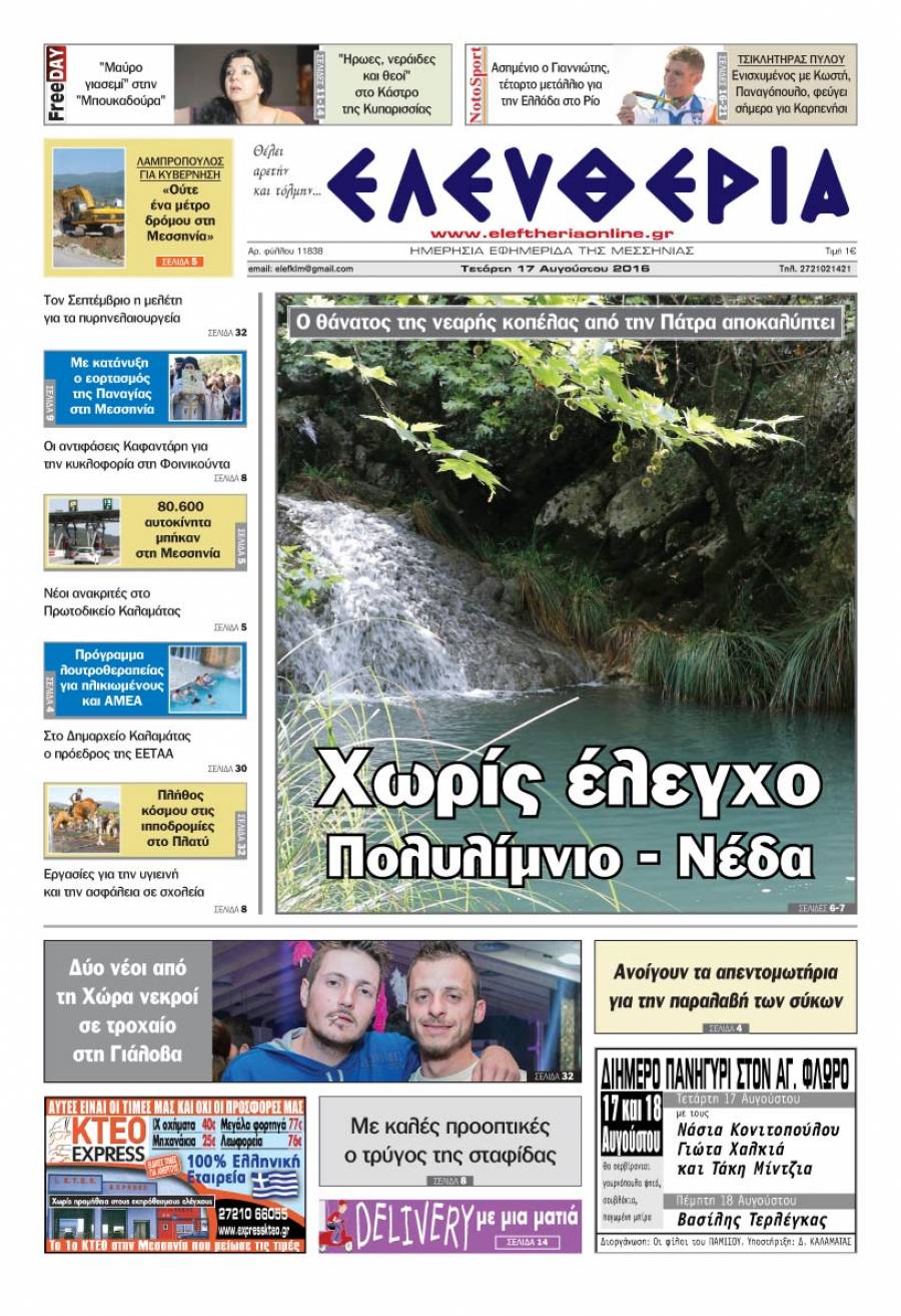 Το πρωτοσέλιδο της "Ελευθερίας" - Τετάρτη 17 Αυγούστου 2016 Για να κατεβάσετε το αρχείο πατήστε πάνω στο κουμπί που γράφει download pdf