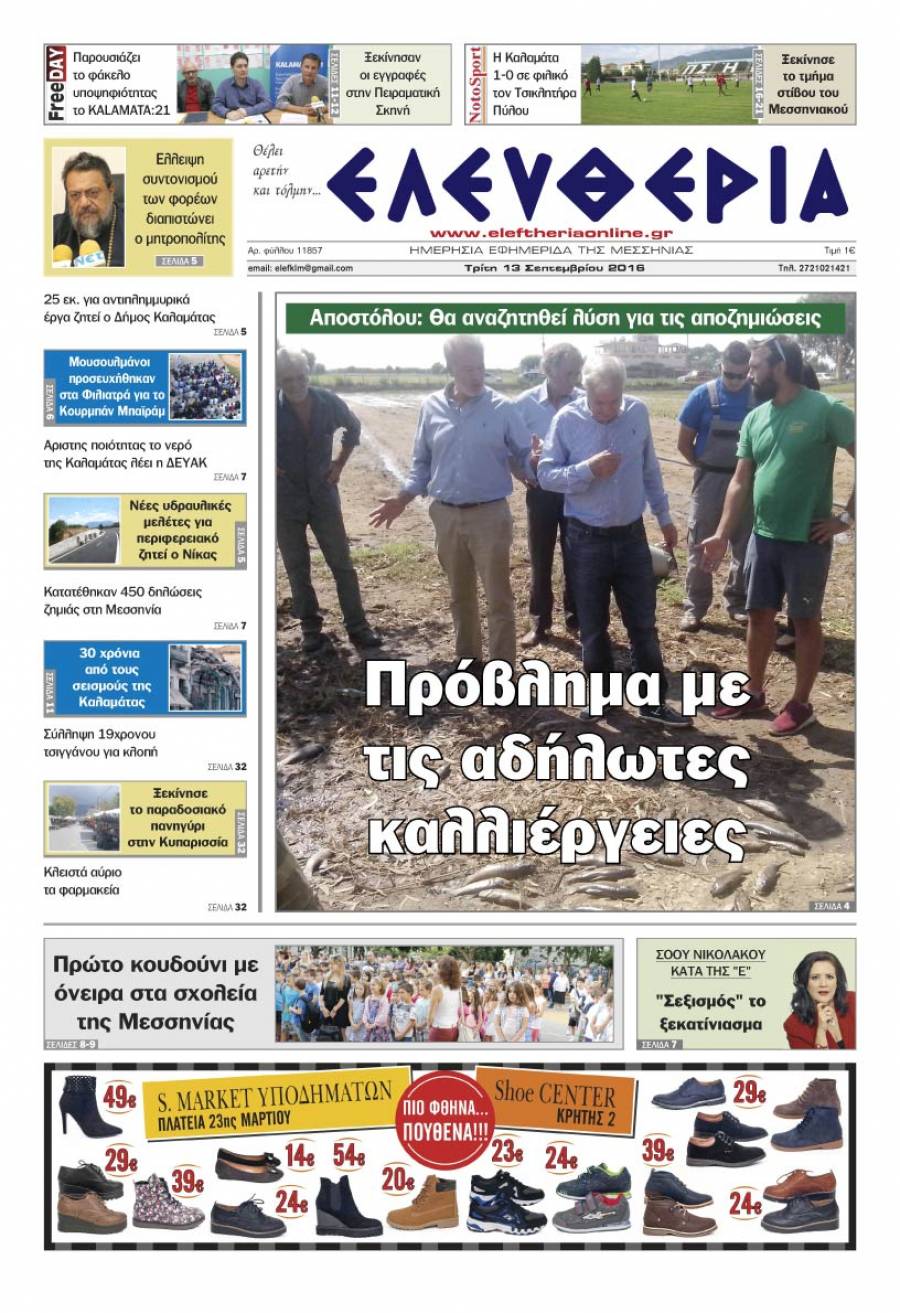 Το πρωτοσέλιδο της "Ελευθερίας" Τρίτη 13 Σεπτεμβρίου 2016 Για να κατεβάσετε το αρχείο πατήστε πάνω στο κουμπί που γράφει download pdf