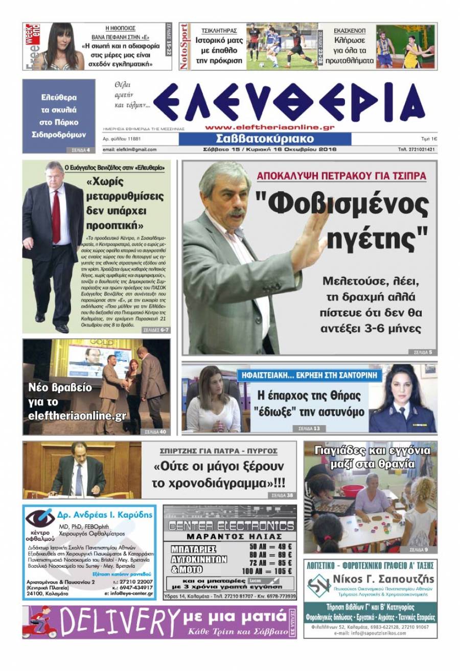 Το πρωτοσέλιδο της "Ελευθερίας Σαββατοκύριακο" 15-16 Οκτωβρίου 2016