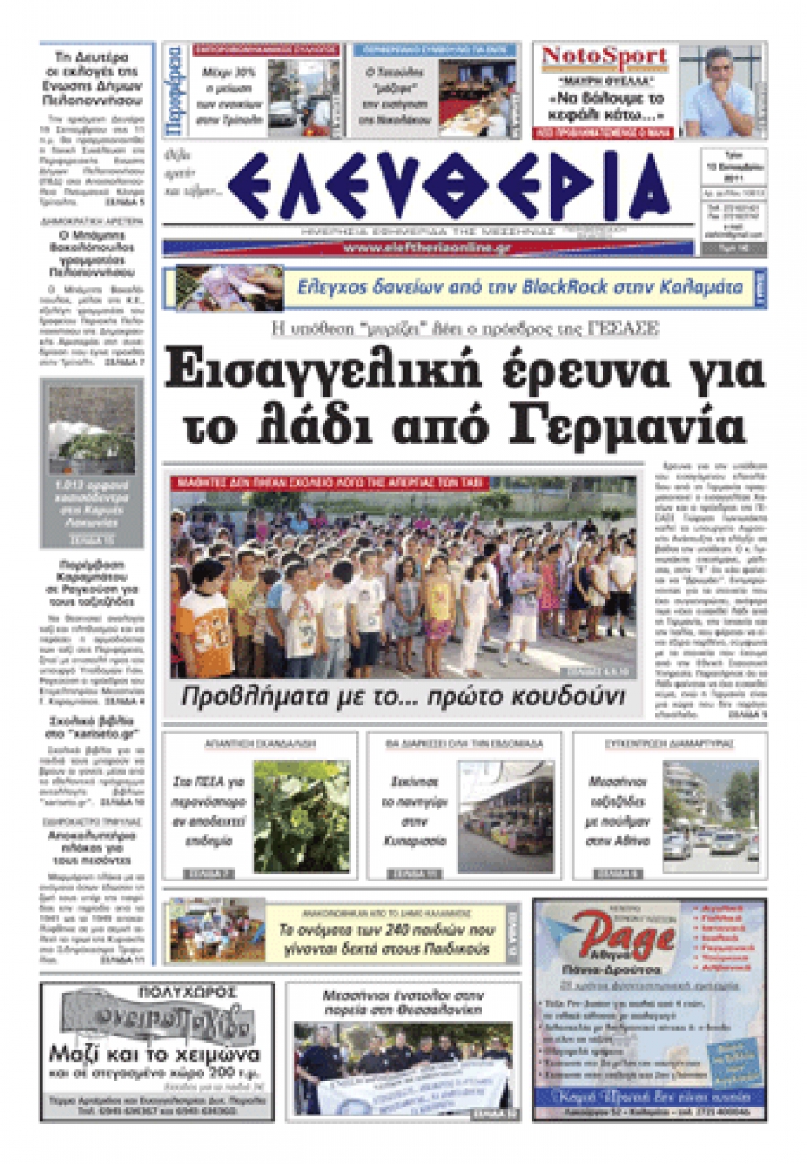 Το πρωτοσέλιδο της "Ελευθερίας" 13 09 2011 Για να κατεβάσετε το αρχείο πατήστε πάνω στο κουμπί που γράφει download pdf