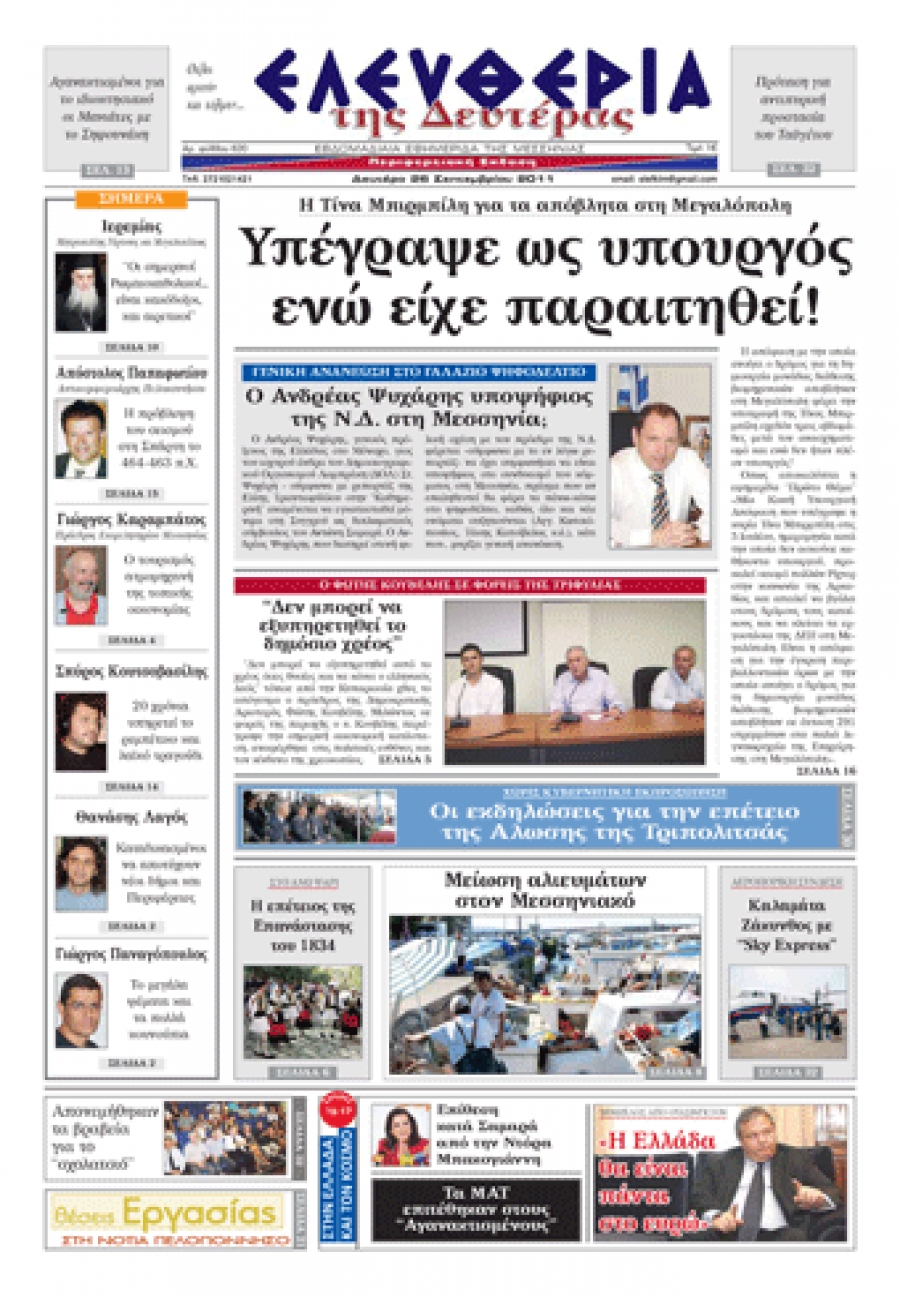 Το πρωτοσέλιδο της "Ελευθερίας" 26 09 2011 Για να κατεβάσετε το αρχείο πατήστε πάνω στο κουμπί που γράφει download pdf