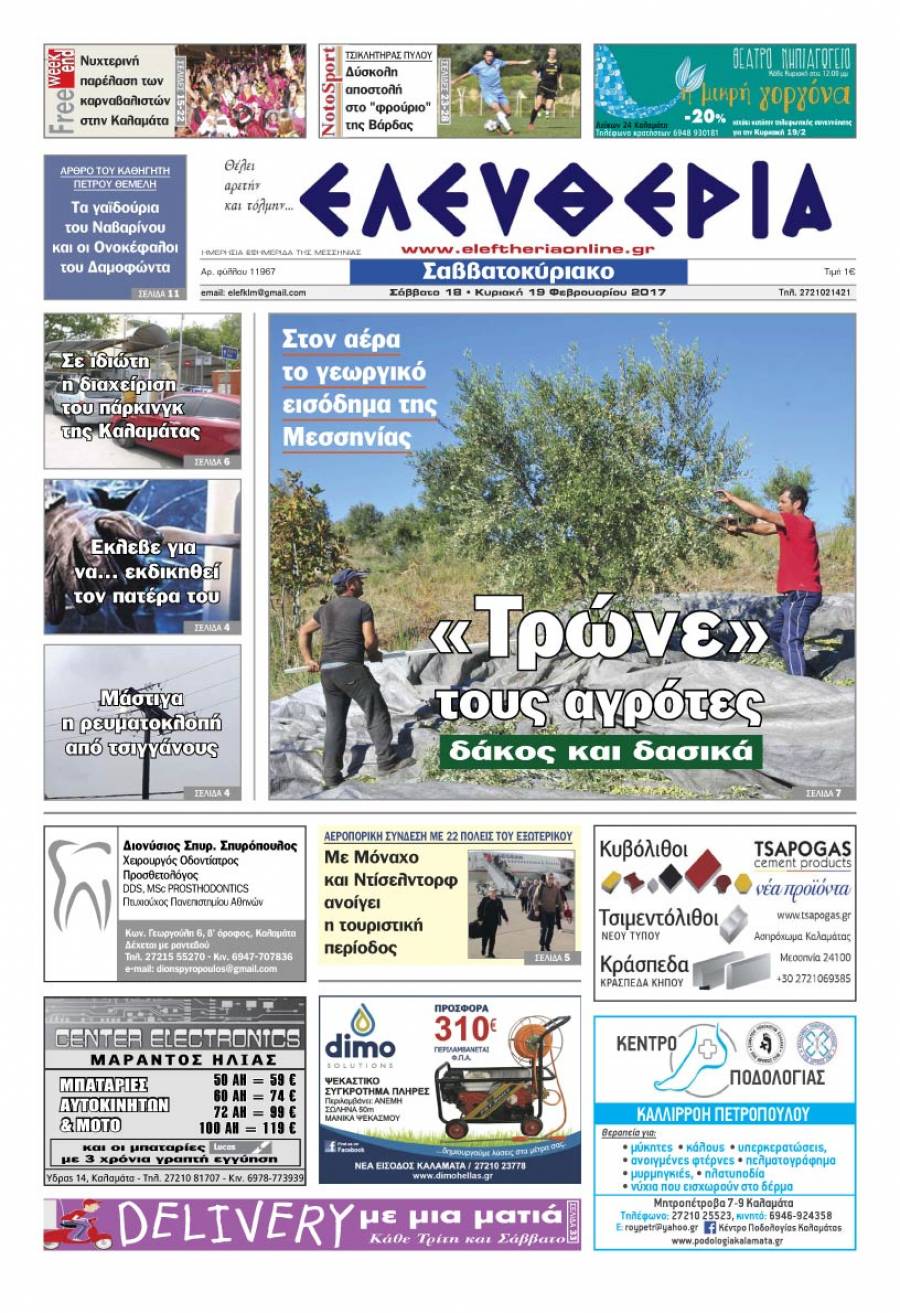 Το πρωτοσέλιδο της "Ελευθερίας Σαββατοκύριακο" 18-19 Φεβρουαρίου 2017