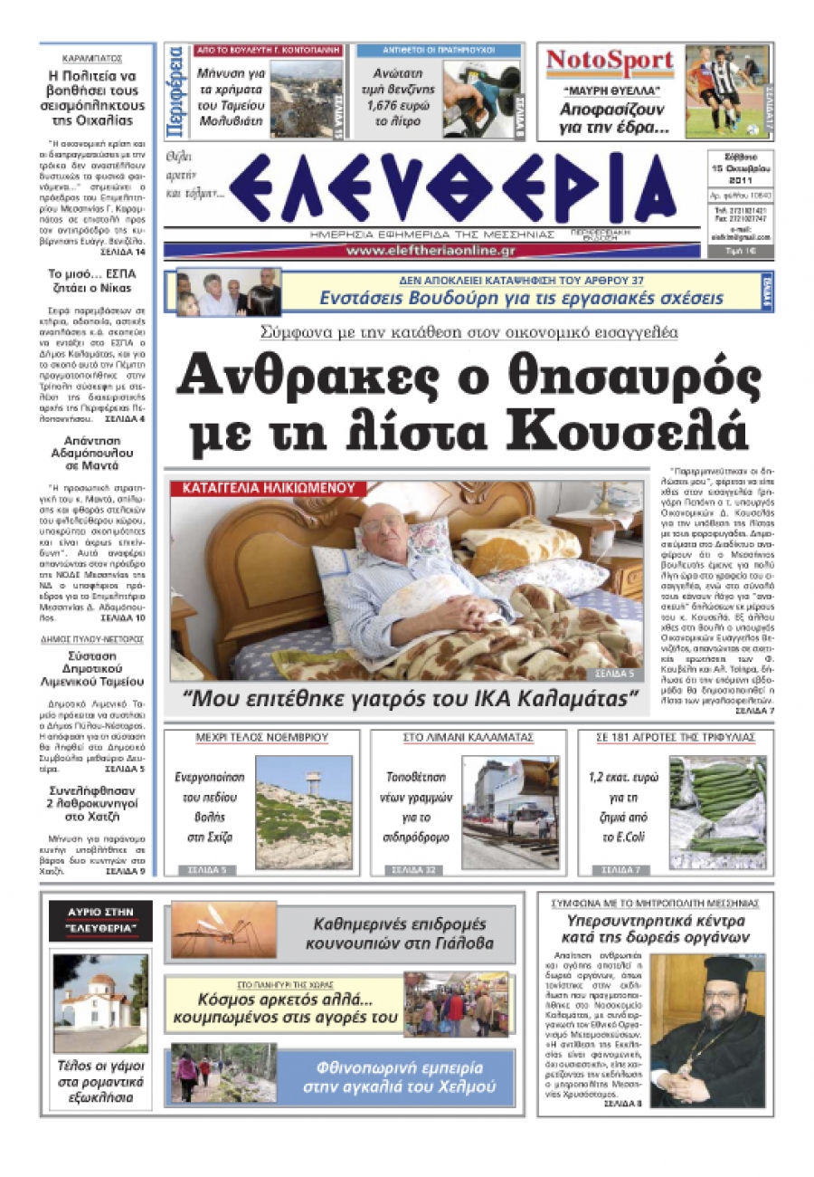 Το πρωτοσέλιδο της "Eλευθερίας" 15 Οκτωβρίου 2011