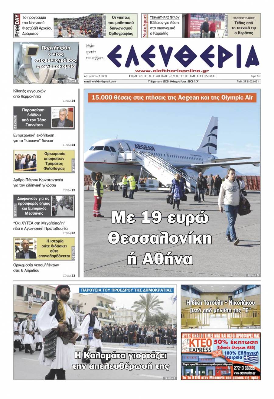 Το πρωτοσέλιδο της "Ελευθερίας" - Πέμπτη 23 Μαρτίου 2017 Για να κατεβάσετε το αρχείο πατήστε πάνω στο κουμπί που γράφει download pdf