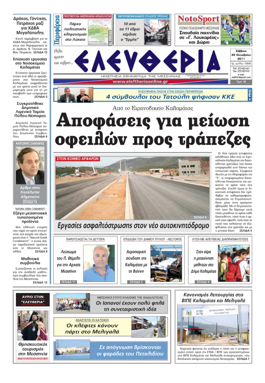 Το πρωτοσέλιδο της "Ελευθερίας" 22 Οκτωβρίου 2011