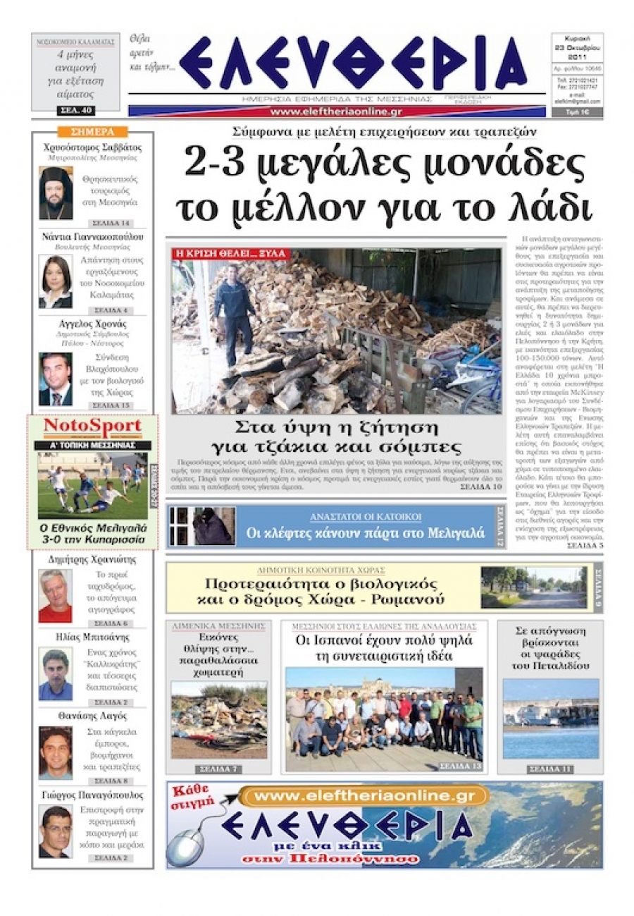 Το πρωτοσέλιδο της "Ελευθερίας" 23 Οκτωβρίου 2011