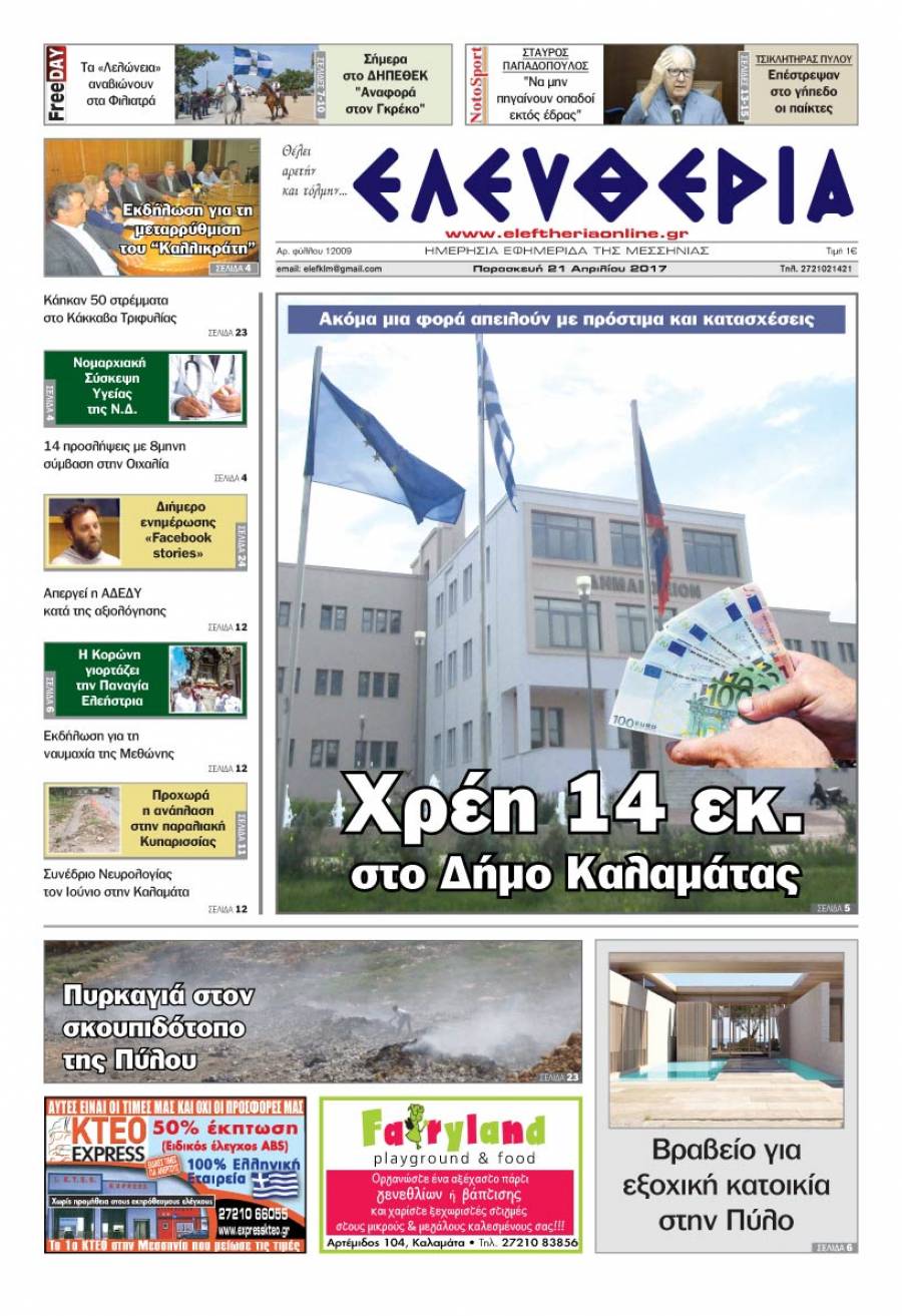 Το πρωτοσέλιδο της "Ελευθερίας" - Παρασκευή 21 Απριλίου 2017 Για να κατεβάσετε το αρχείο πατήστε πάνω στο κουμπί που γράφει download pdf