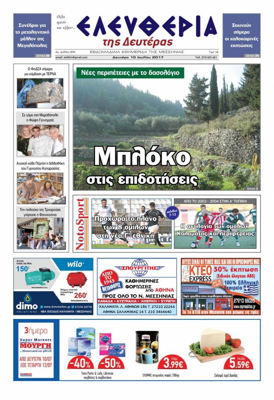 Το πρωτοσέλιδο της "Ελευθερίας της Δευτέρας" - 10 Ιουλίου 2017 Για να κατεβάσετε το αρχείο πατήστε πάνω στο κουμπί που γράφει download pdf