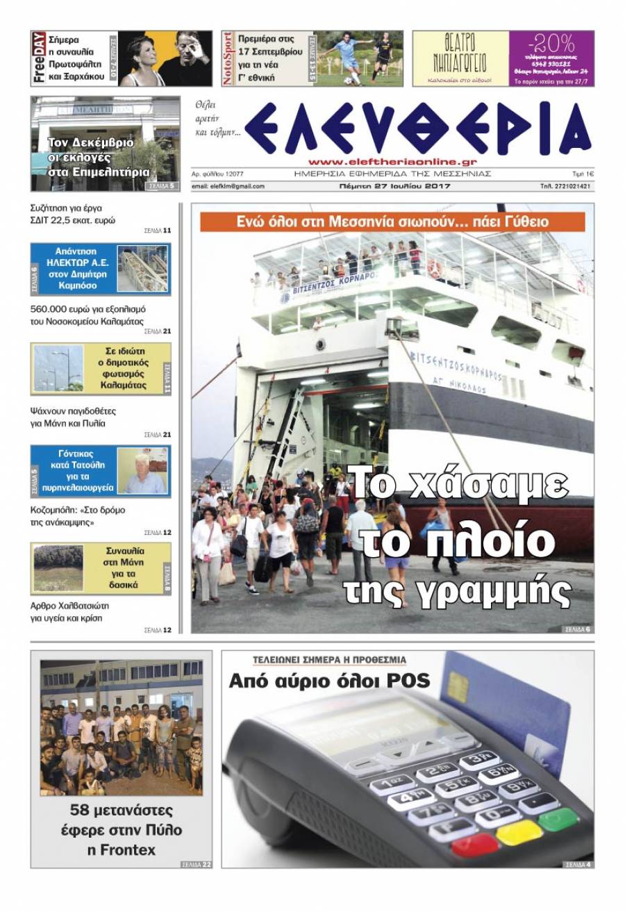 Το πρωτοσέλιδο της "Ελευθερίας" - Πέμπτη 27 Ιουλίου 2017 Για να κατεβάσετε το αρχείο πατήστε πάνω στο κουμπί που γράφει download pdf