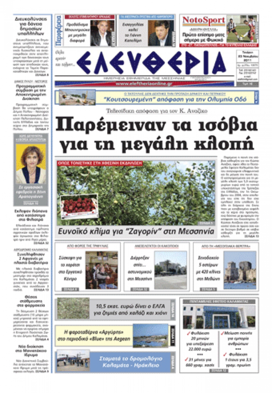 Το πρωτοσέλιδο της "Ελευθερίας" 23 11 2011 Για να κατεβάσετε το αρχείο πατήστε πάνω στο κουμπί που γράφει download pdf