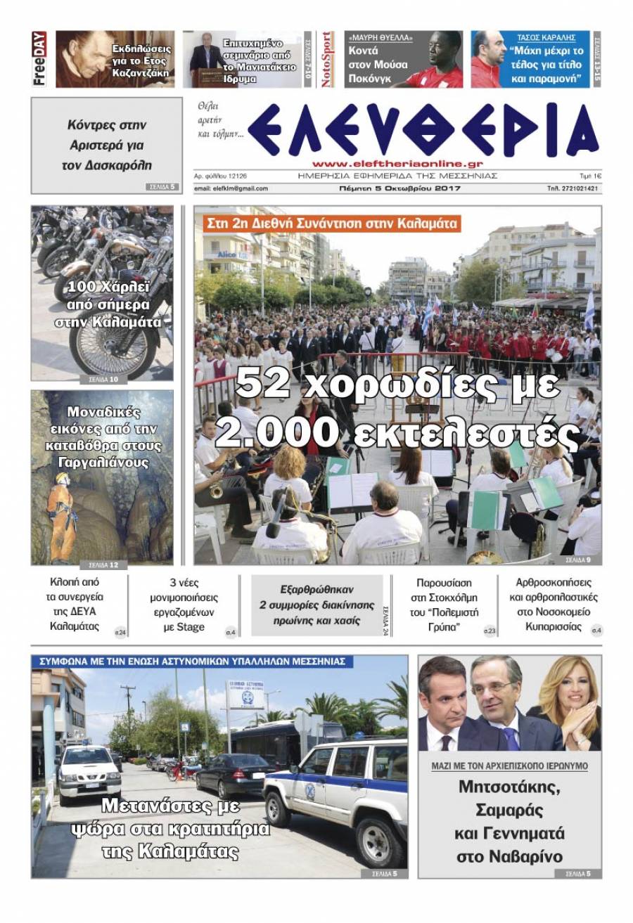 Το πρωτοσέλιδο της "Ελευθερίας" - Πέμπτη 5 Οκτωβρίου 2017 Για να κατεβάσετε το αρχείο πατήστε πάνω στο κουμπί που γράφει download pdf