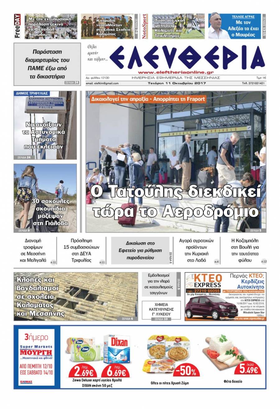 Το πρωτοσέλιδο της "Ελευθερίας" - Τετάρτη 11 Οκτωβρίου 2017 Για να κατεβάσετε το αρχείο πατήστε πάνω στο κουμπί που γράφει download pdf