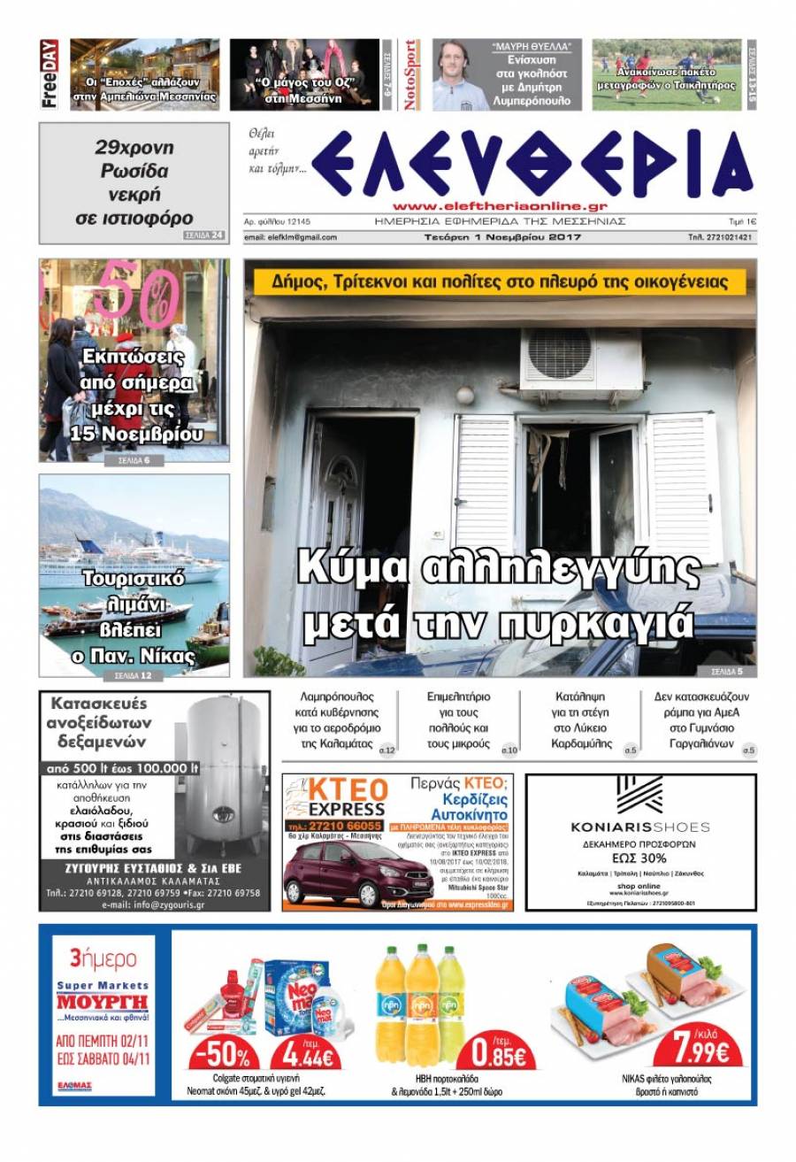 Το πρωτοσέλιδο της "Ελευθερίας" - Τετάρτη 1 Νοεμβρίου 2017 Για να κατεβάσετε το αρχείο πατήστε πάνω στο κουμπί που γράφει download pdf