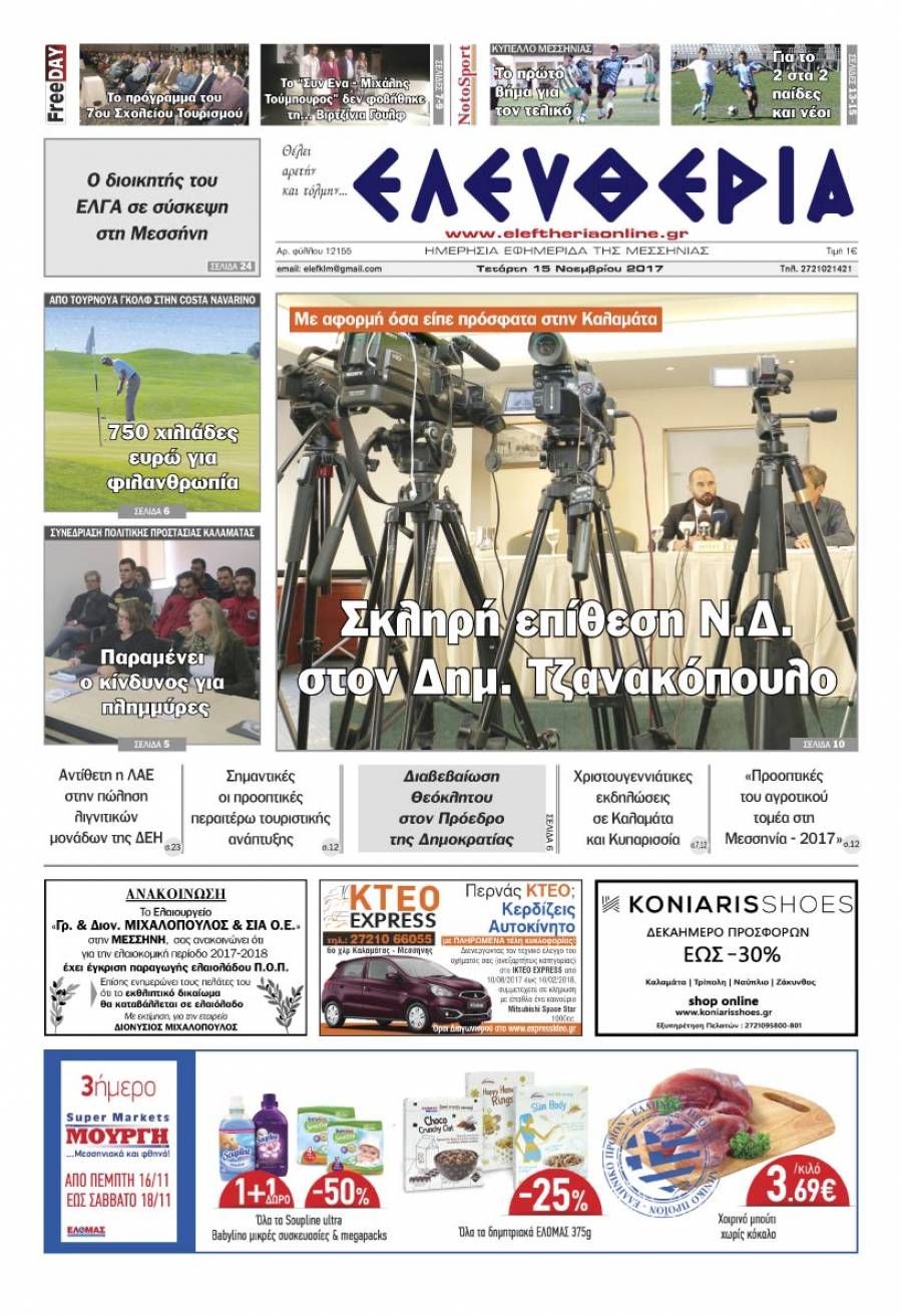 Το πρωτοσέλιδο της "Ελευθερίας" - Τετάρτη 15 Νοεμβρίου 2017 Για να κατεβάσετε το αρχείο πατήστε πάνω στο κουμπί που γράφει download pdf