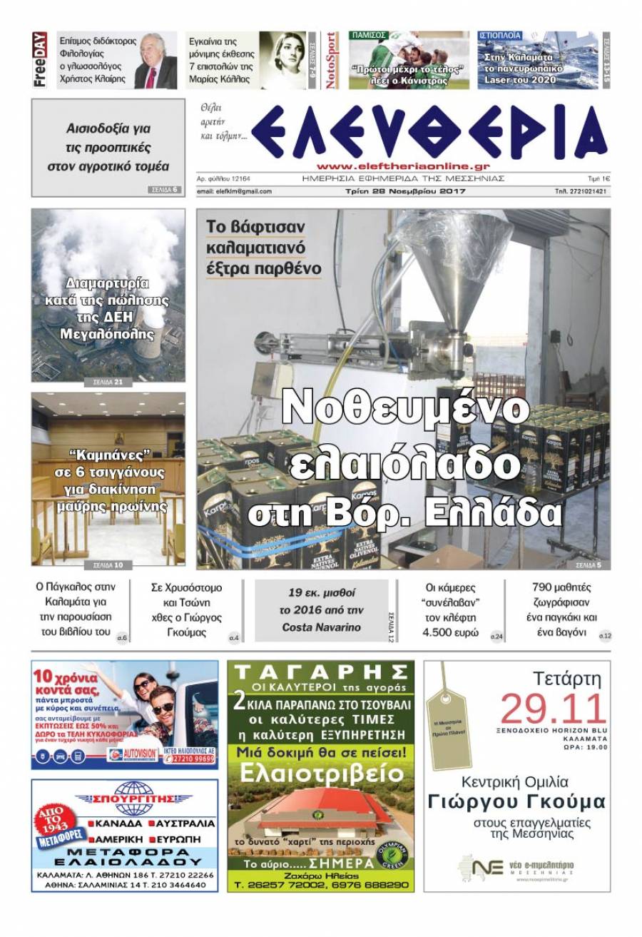 Το πρωτοσέλιδο της "Ελευθερίας" - Τρίτη 28 Νοεμβρίου 2017 Για να κατεβάσετε το αρχείο πατήστε πάνω στο κουμπί που γράφει download pdf