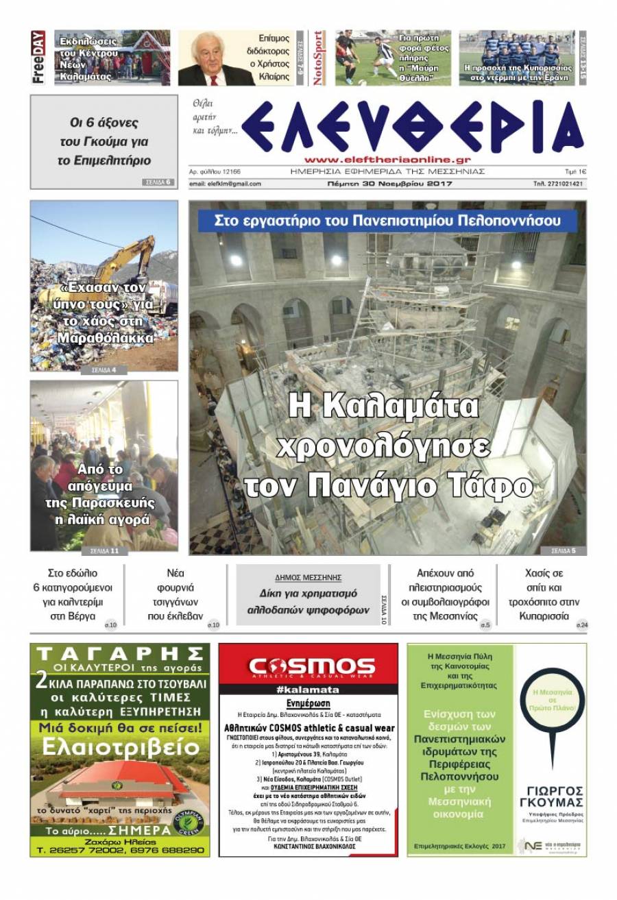 Το πρωτοσέλιδο της "Ελευθερίας" - Πέμπτη 30 Νοεμβρίου 2017 Για να κατεβάσετε το αρχείο πατήστε πάνω στο κουμπί που γράφει download pdf