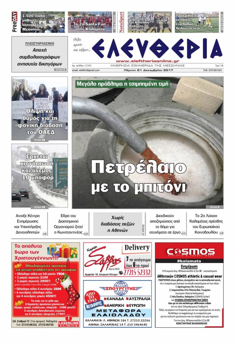 Το πρωτοσέλιδο της "Ελευθερίας" - Πέμπτη 21 Δεκεμβρίου 2017 Για να κατεβάσετε το αρχείο πατήστε πάνω στο κουμπί που γράφει download pdf