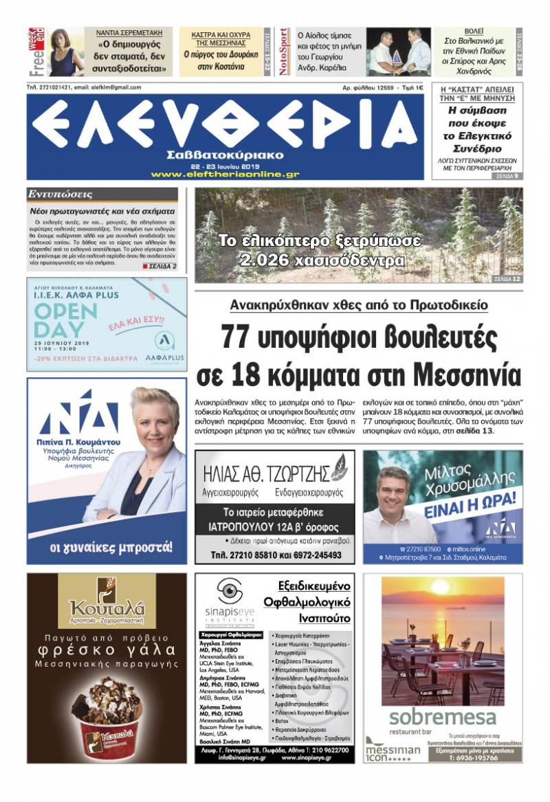 Το πρωτοσέλιδο της "Ελευθερίας Σαββατοκύριακο" 22-23 Ιουνίου 2019 Για να κατεβάσετε το αρχείο πατήστε πάνω στο κουμπί που γράφει download pdf
