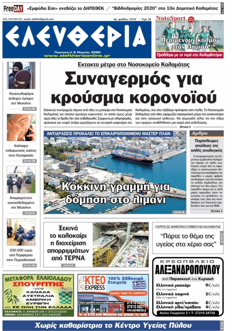Το πρωτοσέλιδο της "Ελευθερίας" - Παρασκευή 6 Μαρτίου 2020 Για να κατεβάσετε το αρχείο πατήστε πάνω στο κουμπί που γράφει download pdf