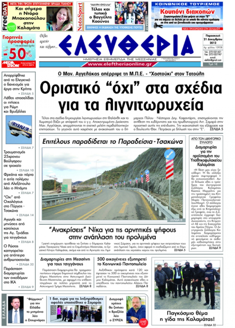 Το σημερινό πρωτοσέλιδο της Ελευθερίας της Παρασκευής 21 Δεκεμβρίου 2012.