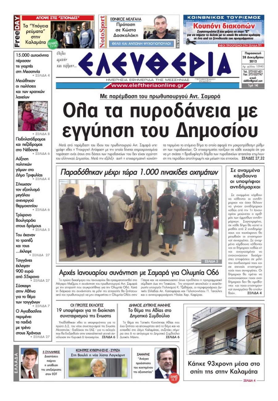 Το πρωτοσέλιδο της Ελευθερίας της Παρασκευής 28 Δεκεμβρίου 2012