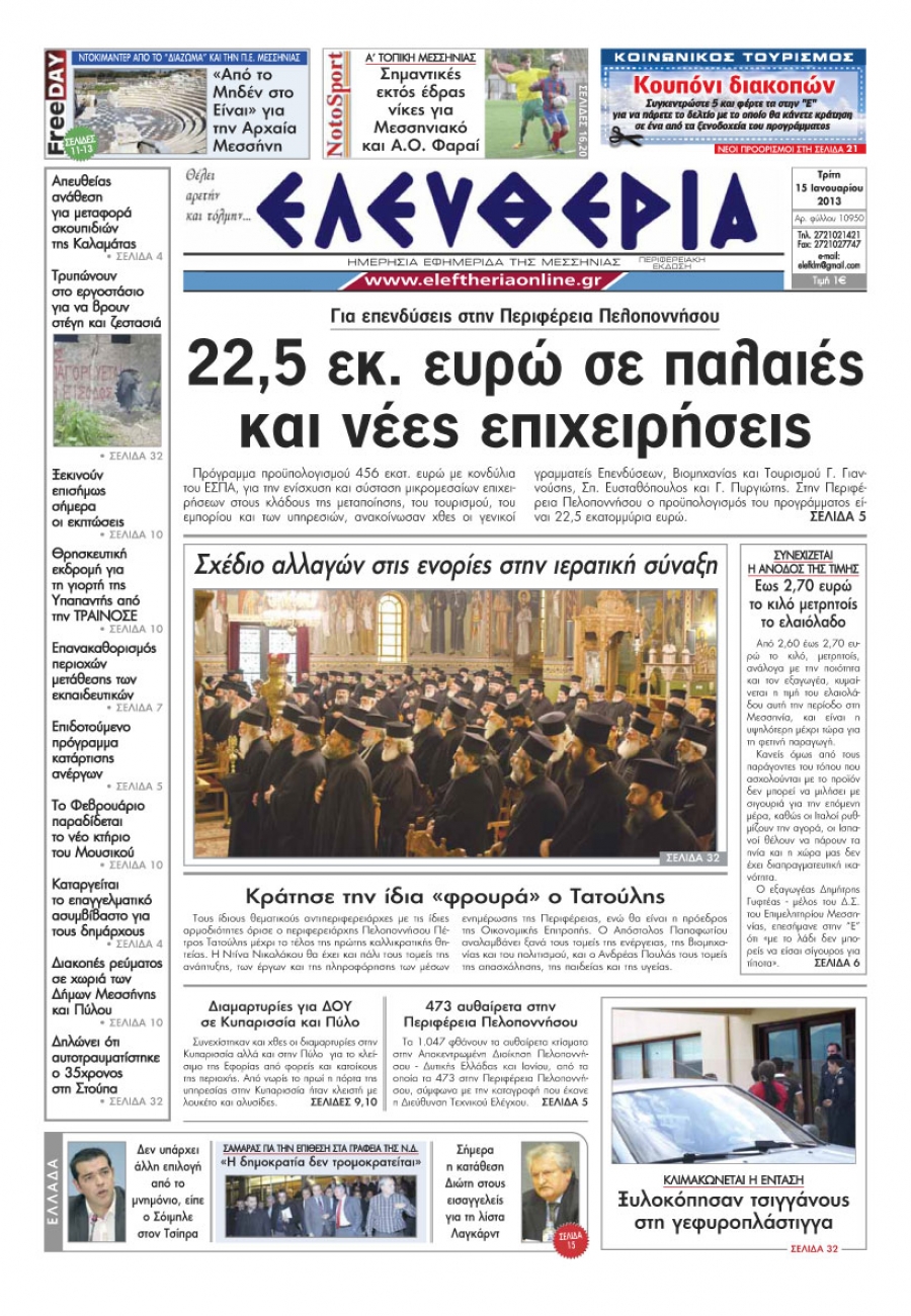 Το πρωτοσέλιδο της Ελευθερίας της Τρίτη 15 Ιανουαρίου 2013