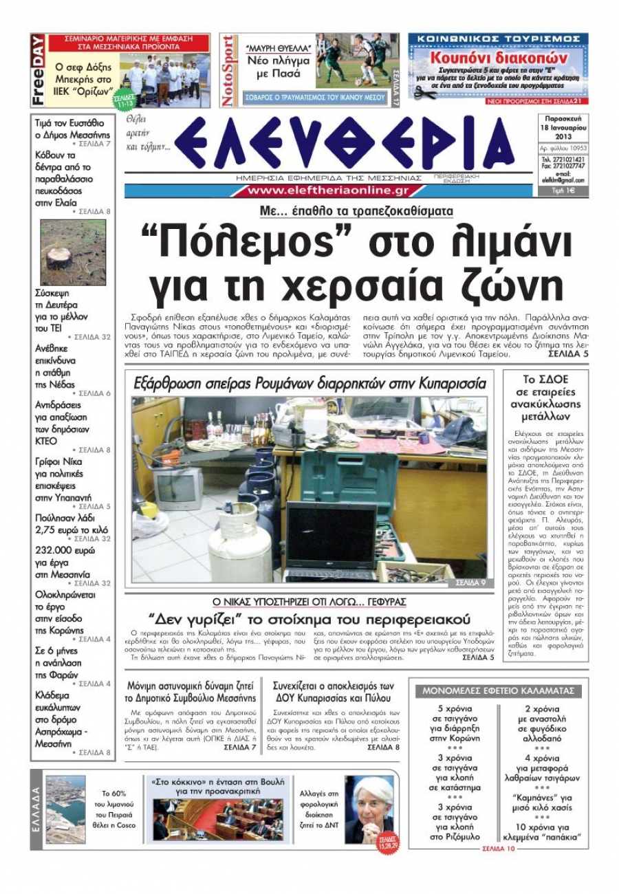 Το πρωτοσέλιδο της "Ελευθερίας" της Παρασκευής 18 Ιανουαρίου 2013