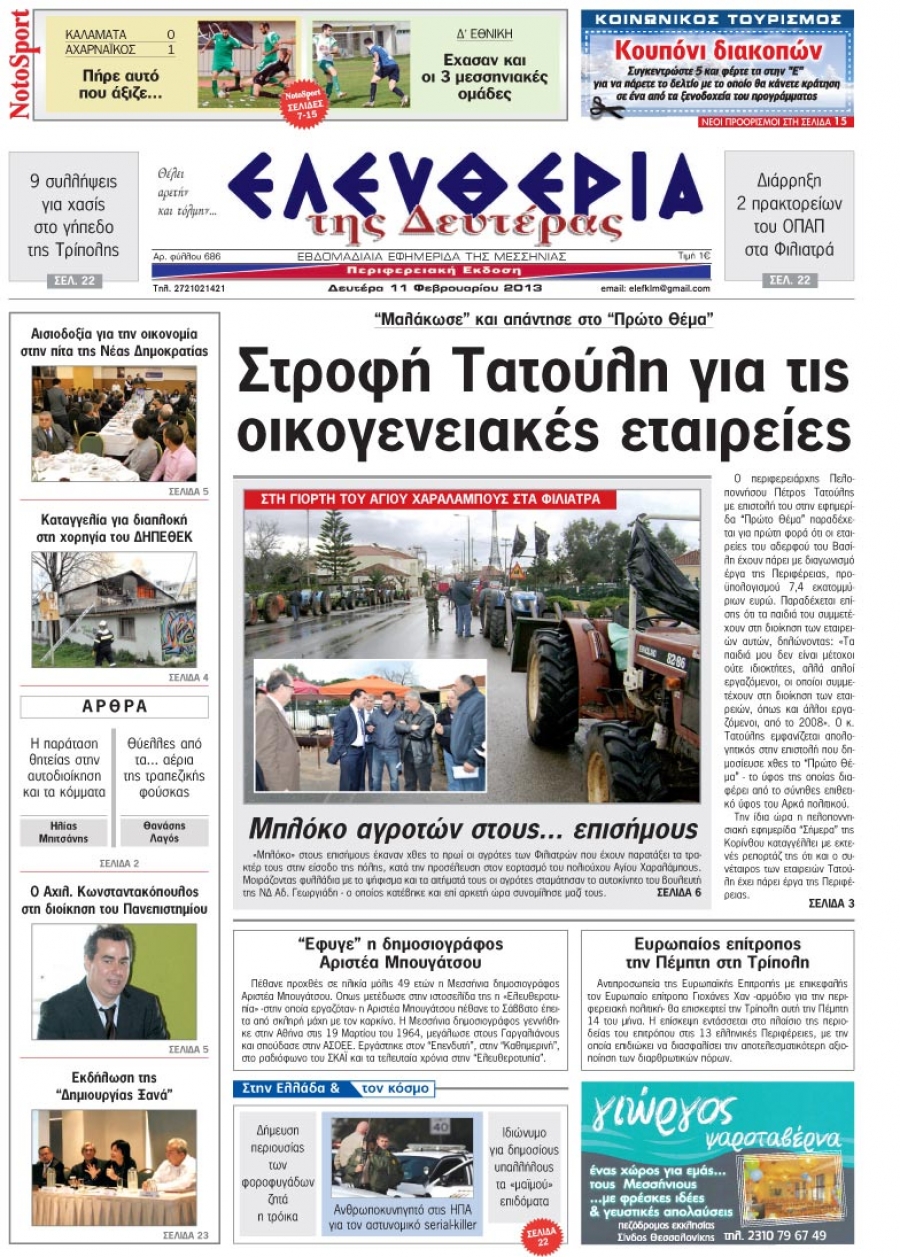 Το πρωτοσέλιδο της Ελευθερίας της Δευτέρας 11 Φεβρουαρίου 2013