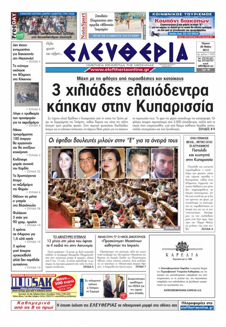 Το πρωτοσέλιδο της "Ελευθερίας" της Πέμπτης 30 Μαΐου 2013 Για να κατεβάσετε το αρχείο πατήστε πάνω στο κουμπί που γράφει download pdf