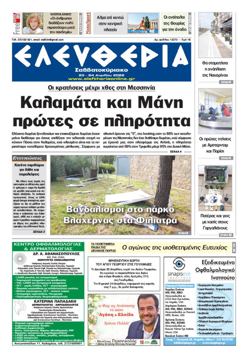 Το πρωτοσέλιδο της "Ελευθερίας Σαββατοκύριακο" 23-24 Απριλίου 2022