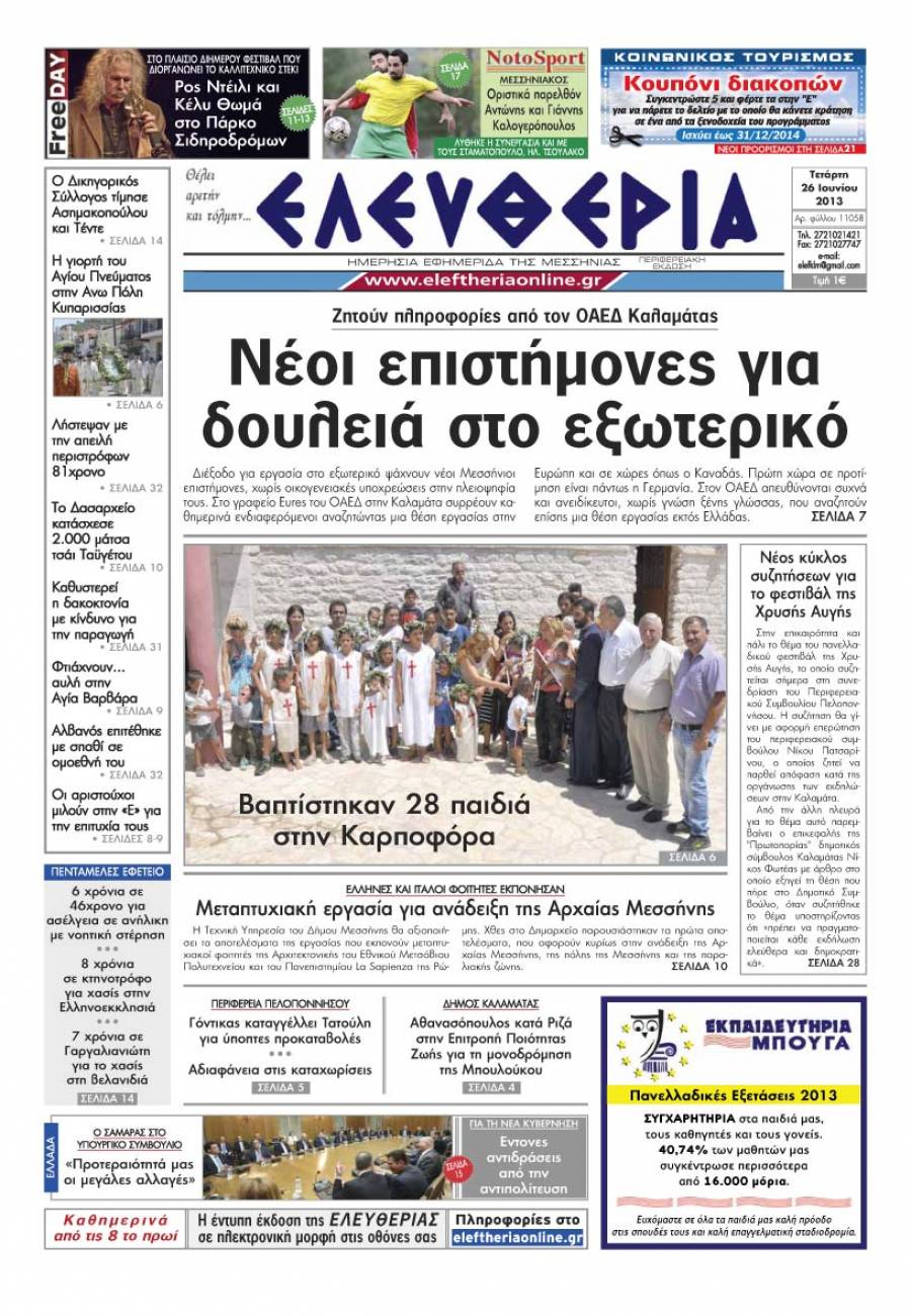 Το πρωτοσέλιδο της "Ελευθερίας" της Τετάρτης 26 Ioυνίου 2013 Για να κατεβάσετε το αρχείο πατήστε πάνω στο κουμπί που γράφει download pdf