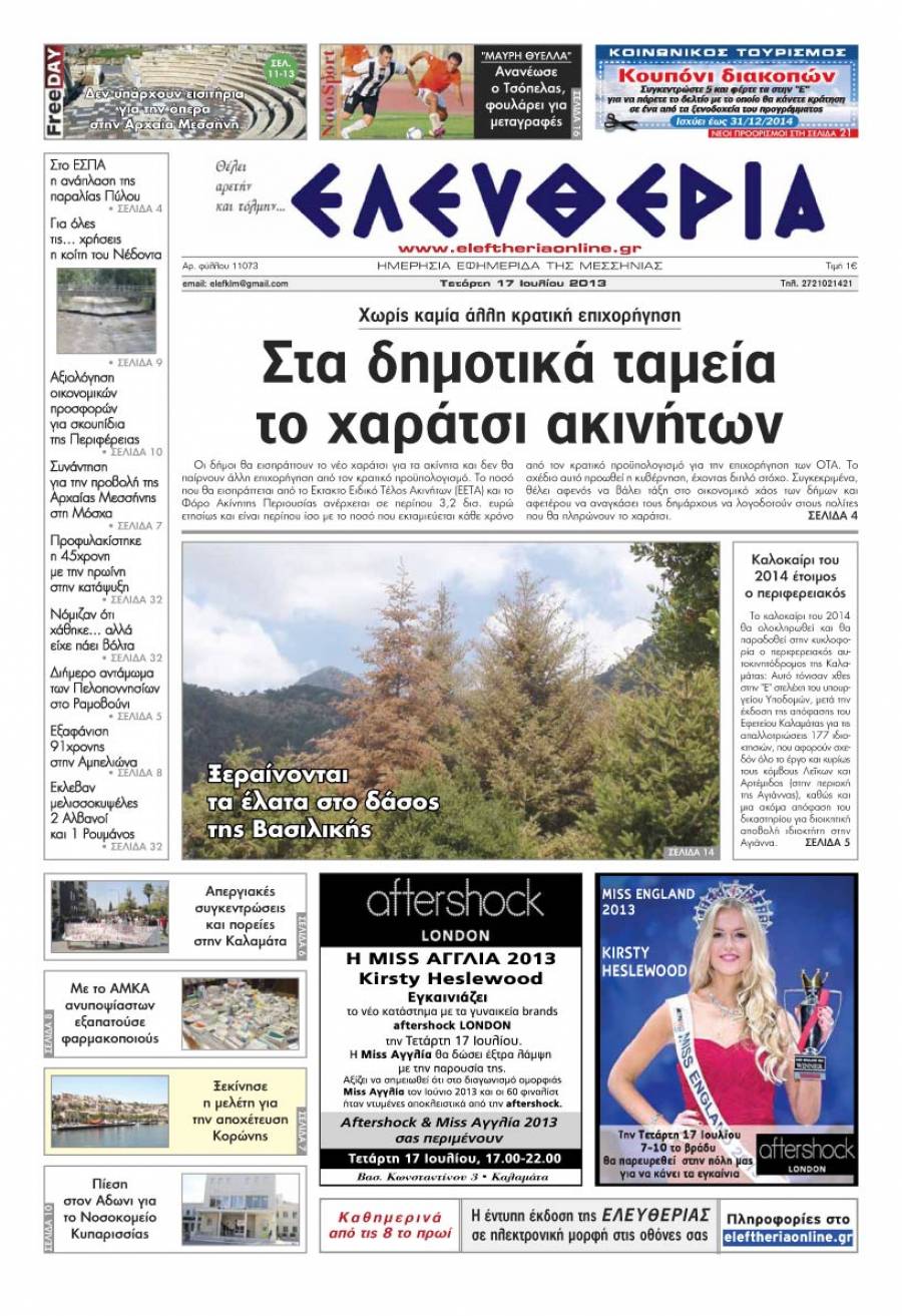 Το πρωτοσέλιδο της "Ελευθερίας" της Τετάρτης 17 Ioυλίου 2013 Για να κατεβάσετε το αρχείο πατήστε πάνω στο κουμπί που γράφει download pdf