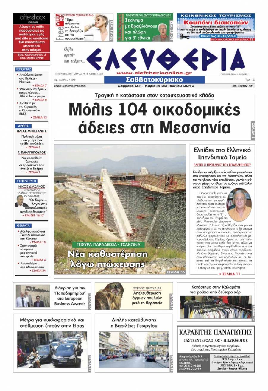 Το πρωτοσέλιδο της "Ελευθερίας" Σαββατοκύριακο 27-28 Ioυλίου 2013 Για να κατεβάσετε το αρχείο πατήστε πάνω στο κουμπί που γράφει download pdf