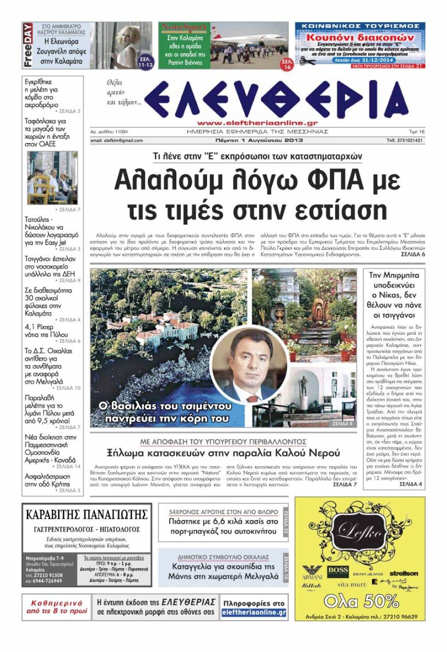 Το πρωτοσέλιδο της "Ελευθερίας" της Πέμπτης 1 Αυγούστου 2013. Για να κατεβάσετε το αρχείο πατήστε πάνω στο κουμπί που γράφει download pdf
