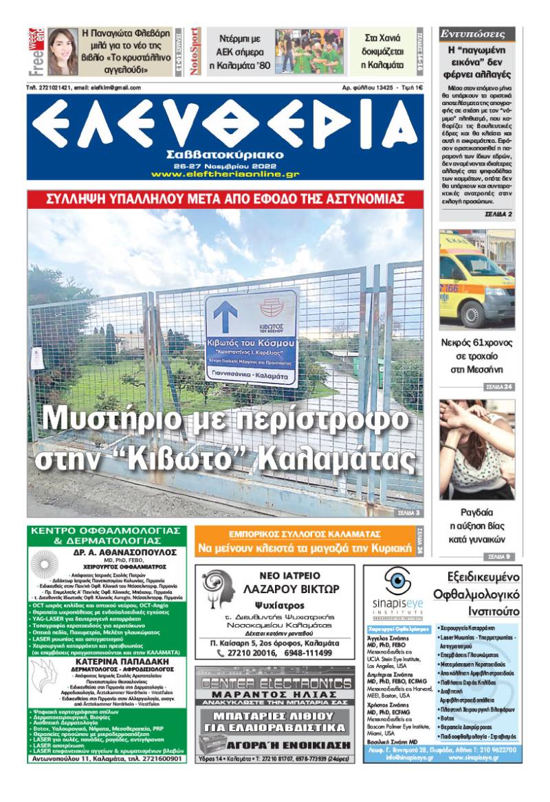 Το πρωτοσέλιδο της "Ελευθερίας Σαββατοκύριακο" 26-27 Νοεμβρίου 2022
