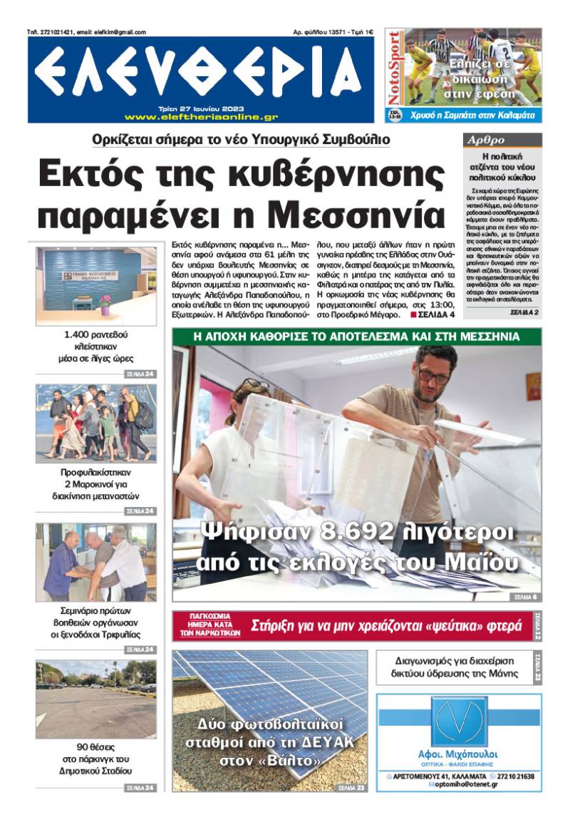 Το πρωτοσέλιδο της "Ελευθερίας" - Τρίτη 27 Ιουνίου 2023 Για να κατεβάσετε το αρχείο πατήστε πάνω στο κουμπί που γράφει download pdf