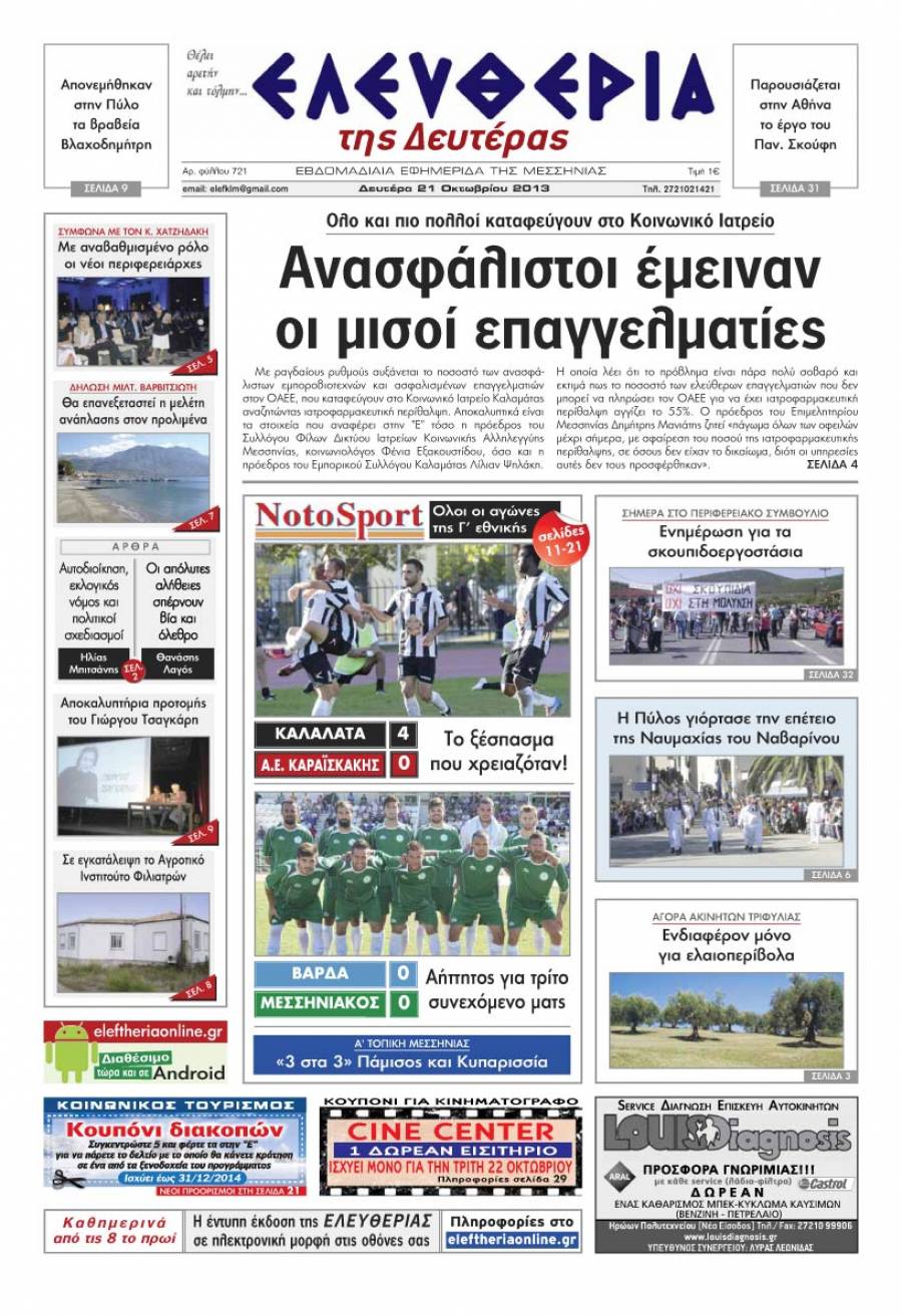 Το πρωτοσέλιδο της "Ελευθερίας" της Δευτέρας 21 Οκτωβρίου 2013 Για να κατεβάσετε το αρχείο πατήστε πάνω στο κουμπί που γράφει download pdf