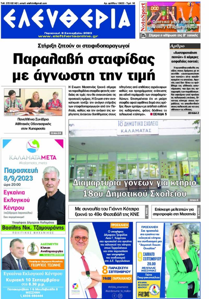Το πρωτοσέλιδο της "Ελευθερίας" -Παρασκευή 8 Σεπτεμβρίου 2023
