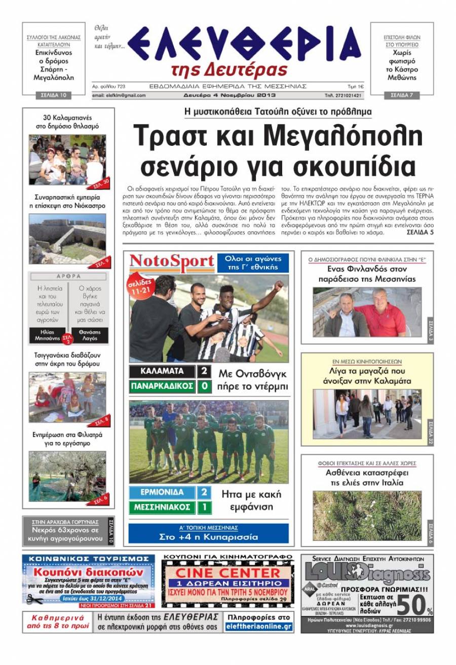 Το πρωτοσέλιδο της "Ελευθερίας" της Δευτέρας 4 Νοεμβρίου 2013 Για να κατεβάσετε το αρχείο πατήστε πάνω στο κουμπί που γράφει download pdf