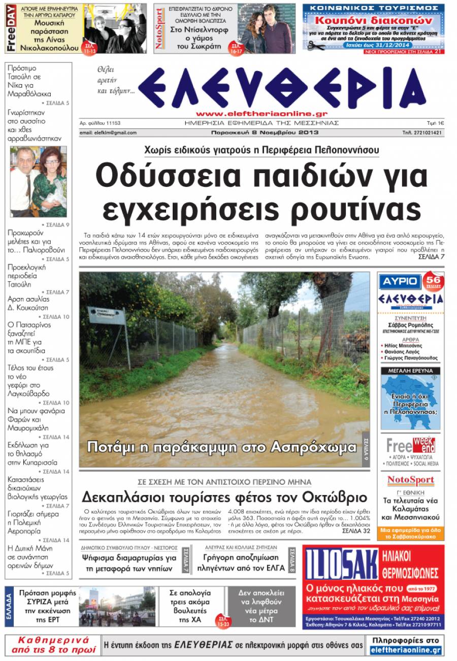 Το πρωτοσέλιδο της "Ελευθερίας" της Παρασκευής 8 Νοεμβρίου 2013 Για να κατεβάσετε το αρχείο πατήστε πάνω στο κουμπί που γράφει download pdf