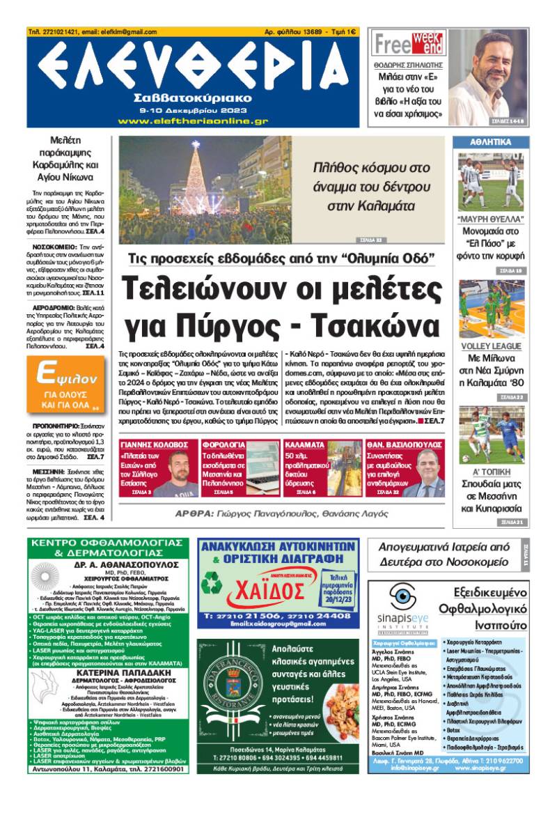 Το πρωτοσέλιδο της "Ελευθερίας Σαββατοκύριακο" 9-10 Δεκεμβρίου 2023