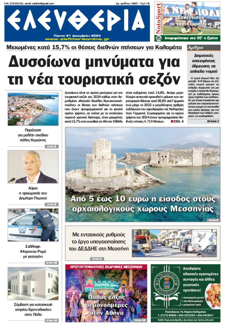 "Ελευθερία" - Πέμπτη 21 Δεκεμβρίου 2023