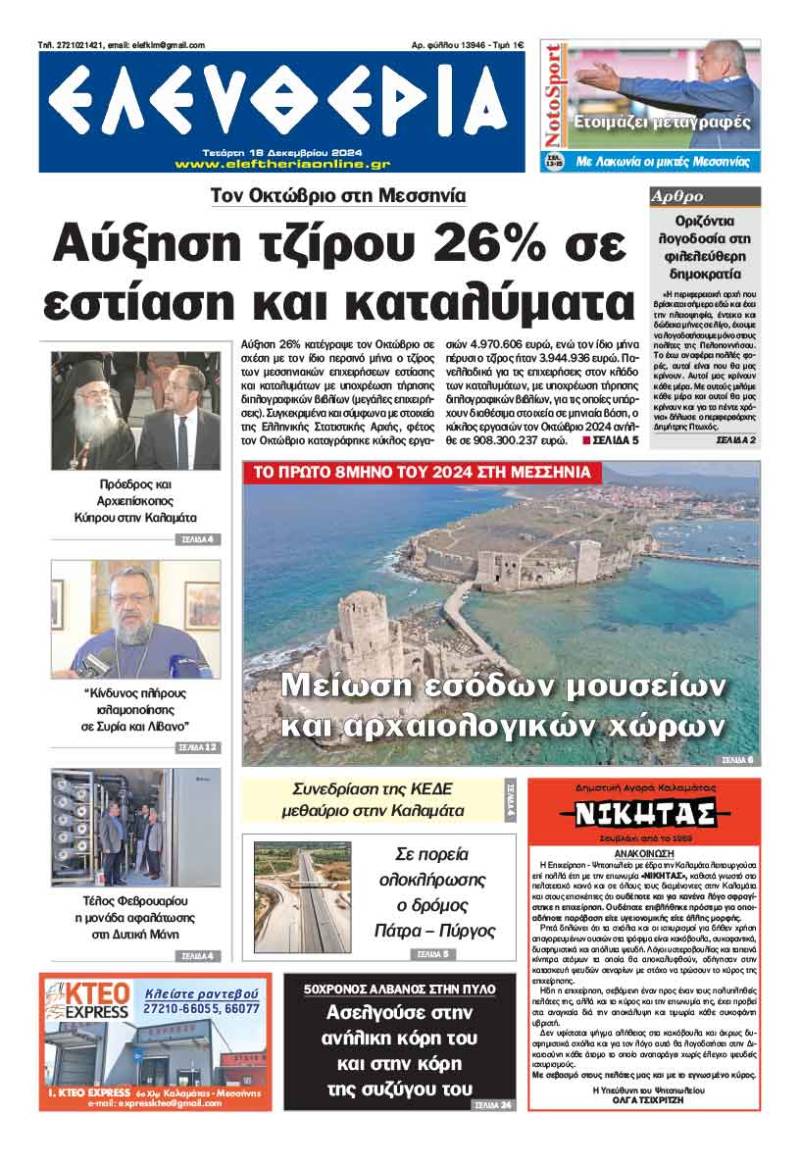 Το πρωτοσέλιδο της "Ελευθερίας" - Τετάρτη 18 Δεκεμβρίου 2024 Για να κατεβάσετε το αρχείο πατήστε πάνω στο κουμπί που γράφει download pdf