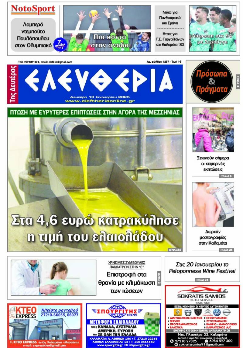 Το πρωτοσέλιδο της "Ελευθερίας της Δευτέρας" 13 Ιανουαρίου 2025 Για να κατεβάσετε το αρχείο πατήστε πάνω στο κουμπί που γράφει download pdf
