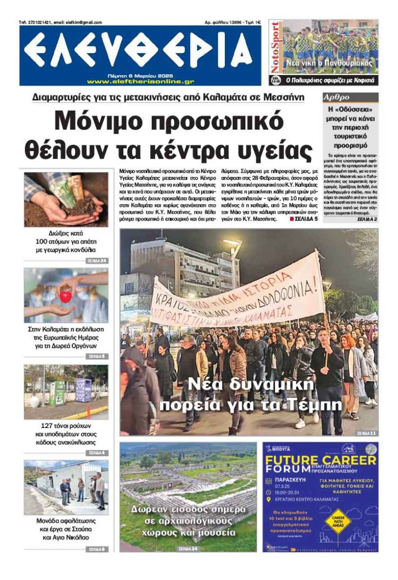 Το πρωτοσέλιδο της "Ελευθερίας" - Πέμπτη 6 Μαρτίου 2025 Για να κατεβάσετε το αρχείο πατήστε πάνω στο κουμπί που γράφει download pdf