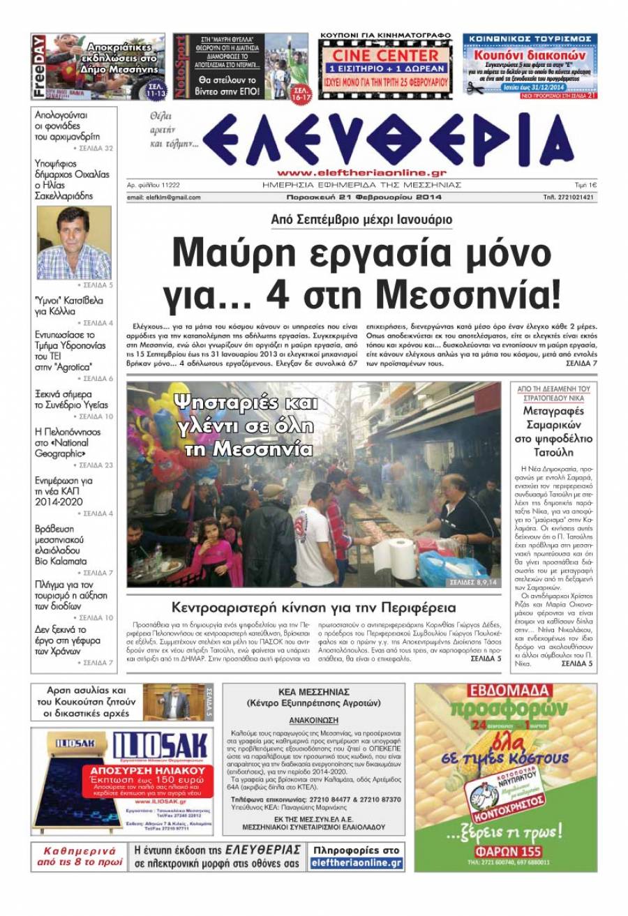 Το πρωτοσέλιδο της "Ελευθερίας" της Παρασκευής 21 Φεβρουαρίου 2014 Για να κατεβάσετε το αρχείο πατήστε πάνω στο κουμπί που γράφει download pdf