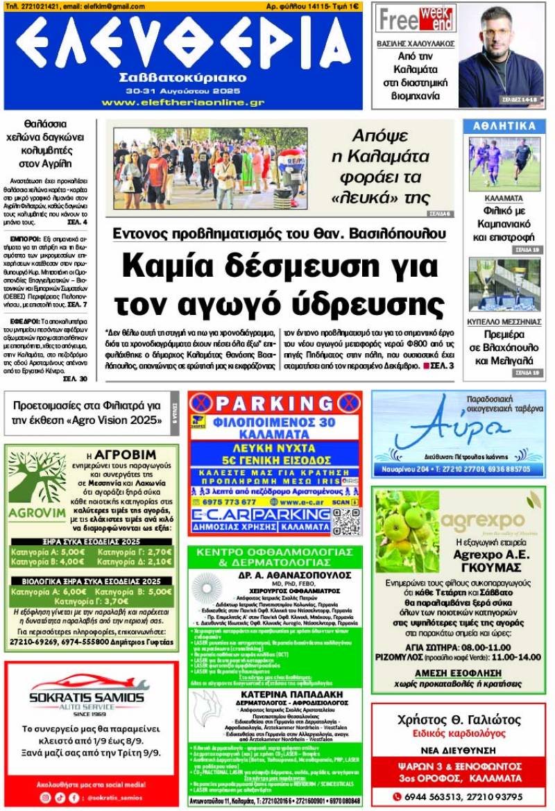 Το πρωτοσέλιδο της "Ελευθερίας Σαββατοκύριακο" 30-31 Αυγούστου 2025