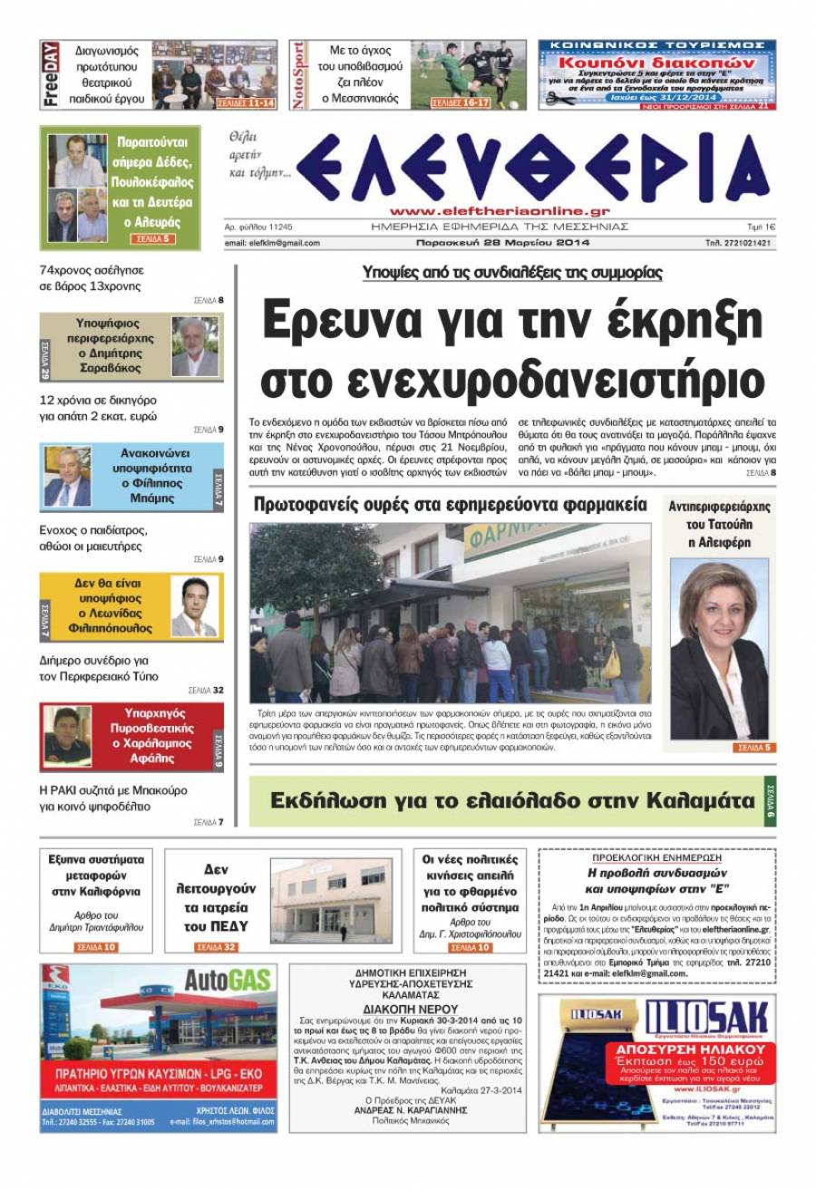 Το πρωτοσέλιδο της "Ελευθερίας" της Παρασκευής 28 Μαρτίου 2014 Για να κατεβάσετε το αρχείο πατήστε πάνω στο κουμπί που γράφει download pdf
