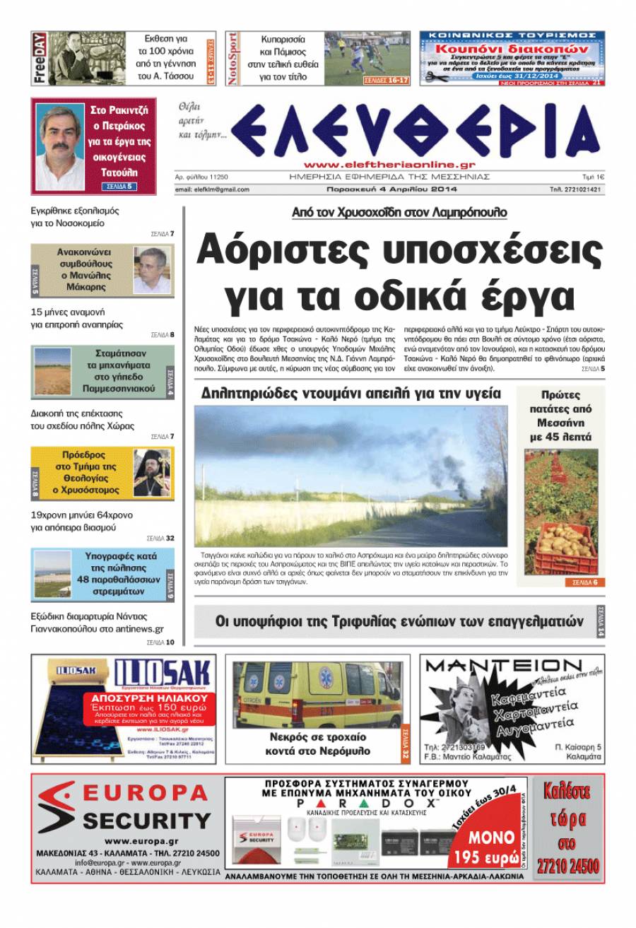 Το πρωτοσέλιδο της "Ελευθερίας" της Παρασκευής 4 Απριλίου 2014 Για να κατεβάσετε το αρχείο πατήστε πάνω στο κουμπί που γράφει download pdf